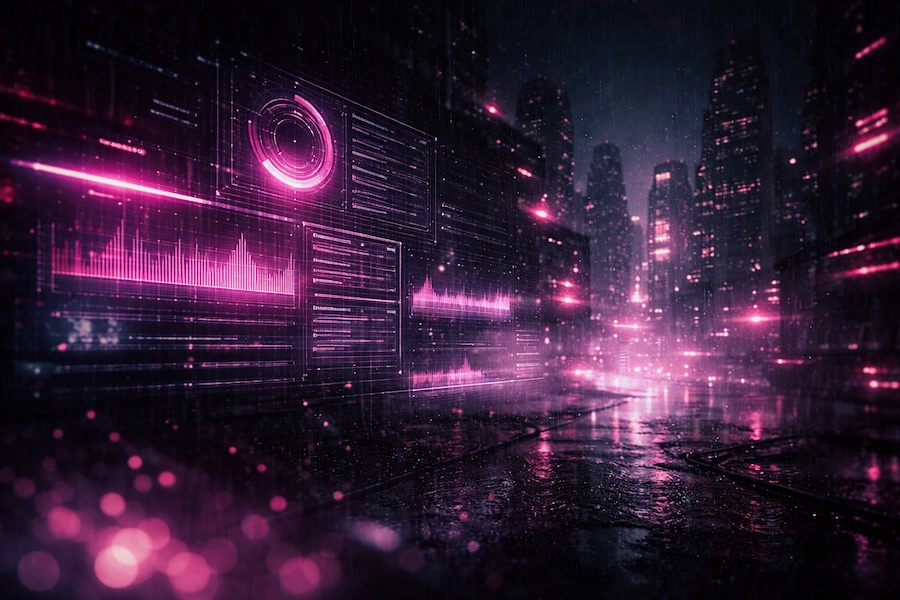 Cada track vive dentro de una ciudad. Arquitectura brutalista, neón y lluvia digital. La música se ve, la imagen se siente.